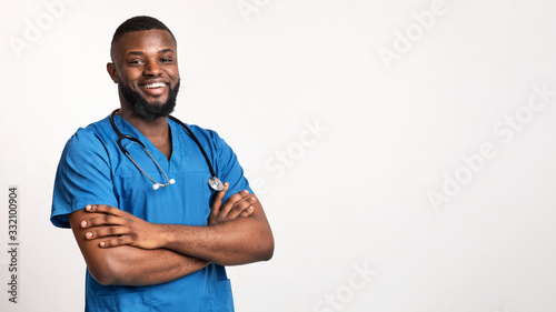 Successful black practitioner posing over white background