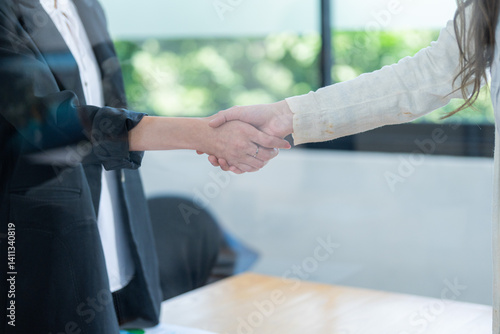 Successful business meeting leading to collaboration between two professionals in a modern office environment