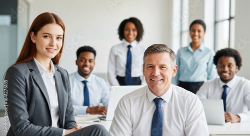 Successful business team portrait. Diverse group of smiling colleagues, led by a mature Caucasian man and a young woman, posing in a modern office.