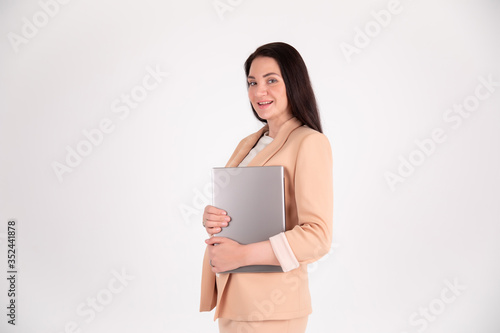 Successful business woman on grey background with copy space. Director in strict suit with laptop