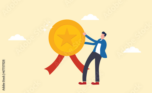 successful businessman and professional entrepreneur bringing star awards.Successful and award winning professional or expert, best office employee or specialist with skills to achieve goals concept.