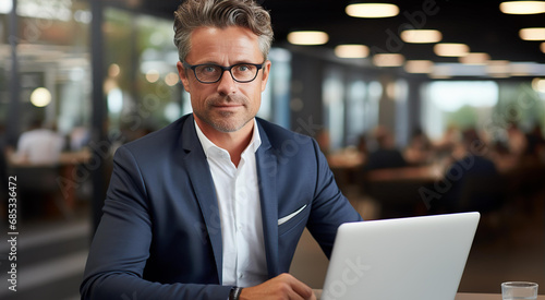 Successful businessman portrait in office. Confident, attractive, professional person with office interior blur at the background