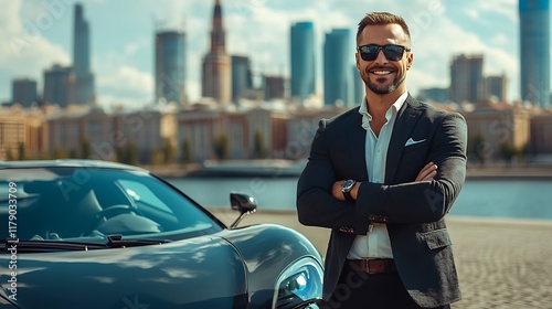 Successful businessman poses with luxury car in urban landscape