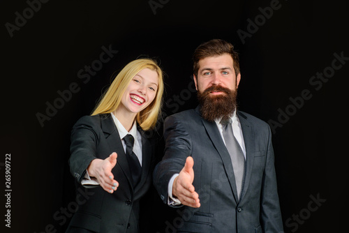 Successful businessman welcoming. Handshaking. Bearded businessman. Businesswoman. Bearded businessman in suit. Hand to welcomed. Office worker. Team work. Team job.