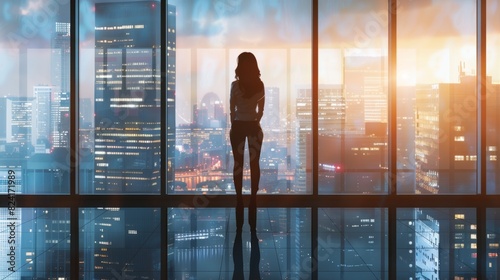 Successful businesswoman looking out of a large window overlooking the city generative ai