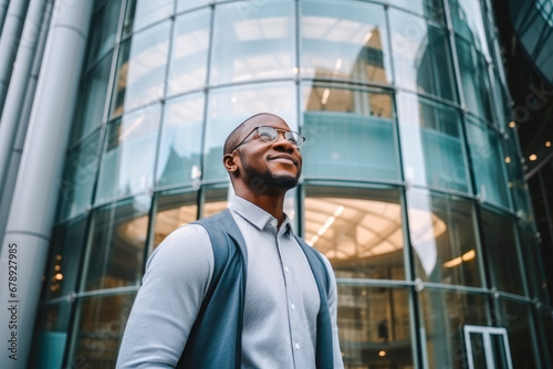 Successful confident African American business manager standing in front of a corporate building, a low-angle view