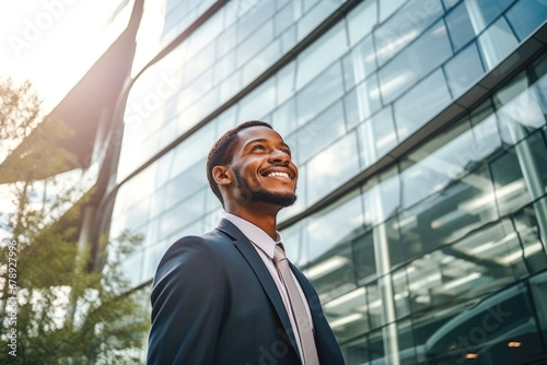 Successful confident African American business manager standing in front of a corporate building, a low-angle view