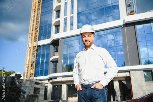 Successful engineer or architect, crane and building construction at backgrpound. Joyous businessman wearing helmet