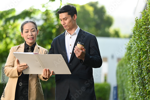 Successful investors are discussing new project estate development, walking on street at modern office district