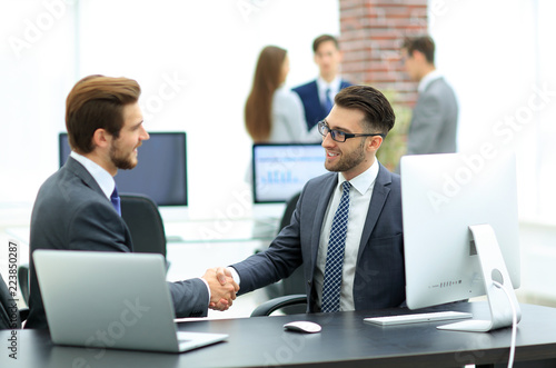 Successful managers shaking hands after closing deal in office