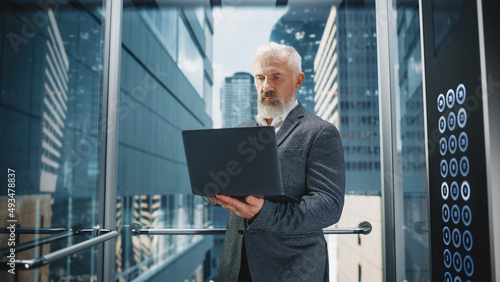 Successful Middle Aged Businessman Riding Glass Elevator to Office in Modern Business Center. Handsome Happy Man Using Laptop Computer, Check Schedule, Social Media and Work Emails in a Lift.