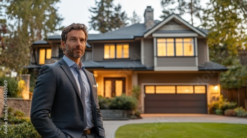 Successful Real Estate Agent Standing Proudly in Front of a Luxurious Home at Dusk