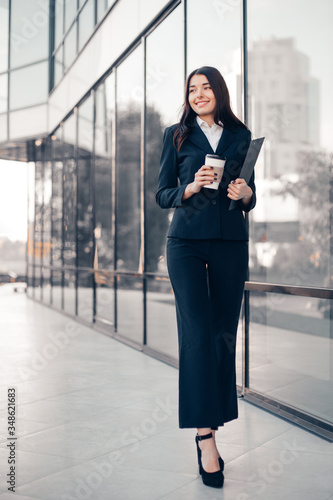 Successful smiling businesswoman or entrepreneur drink coffee in front of his office.