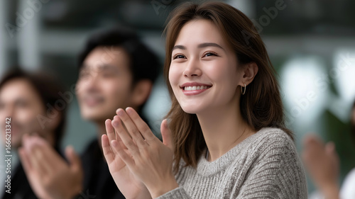 Successful teamwork concept with Asian professionals standing in a bright corporate space, engaged in collective celebration, clapping and raising arms, illustrating productivity, partnership, and ach