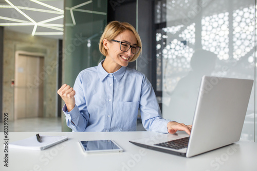 Successful woman celebrating victory and great achievement results at workplace, blonde business woman inside office received online notification on laptop, holding hand up triumph gesture.