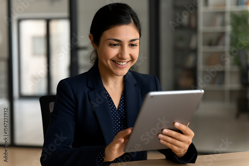 Successful young Indian businesswoman smiling happily while using a digital tablet at her office desk, engaged in work or Browse content