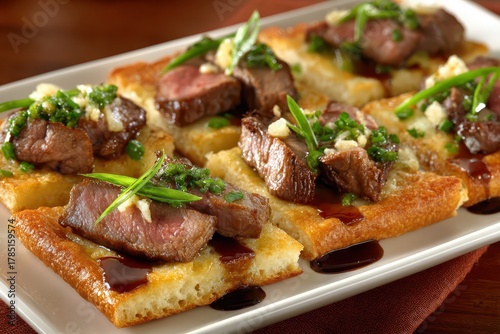 Succulent beef tenderloin on toasted bread with fresh herb sauce and balsamic glaze.