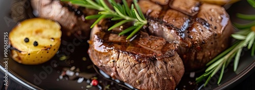 Succulent grilled steak served with herbs and lemon on a dark plate, perfect for gourmet dishes and culinary presentations.