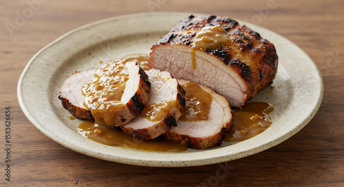 Succulent slices of grilled pork loin, with visible burn marks, served on a ceramic plate with country-style sauce. Served on a rustic wooden table with ambient lighting.