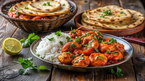 Succulent tandoori prawns garnished with fresh cilantro and served with a side of basmati rice and naan bread on a traditional Indian plate.