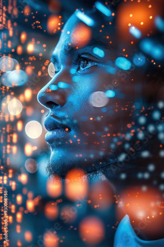Südasiatische Mann blickt in einen digitalen futuristischen Erfolgsbildschirm