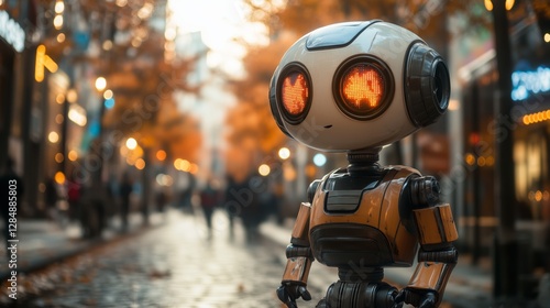 Süßer Roboter spaziert durch herbstliche Einkaufsstraße