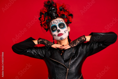 Sugar skull pretty girl with halloween makeup standing on bright red background. Wonderful female zombie with flowers in hair celebrating day of the dead.