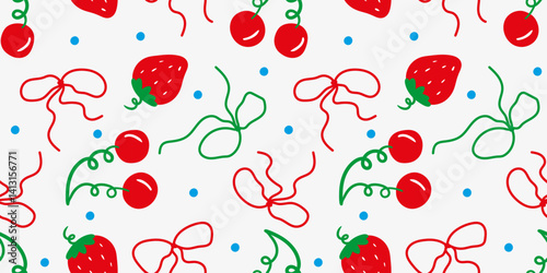 summer background berries pattern seamless vector design simple bows strawberries cherry elements blue polka dots isolated wallpaper background textile design