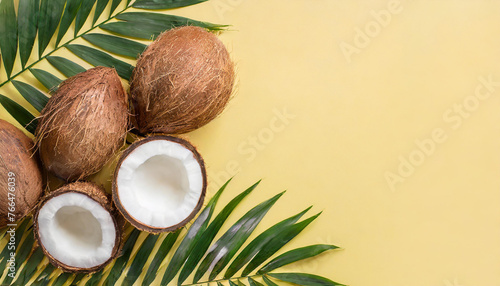 summer banner with coconuts on a light yellow background. Top view, flat lay with a big copy space.