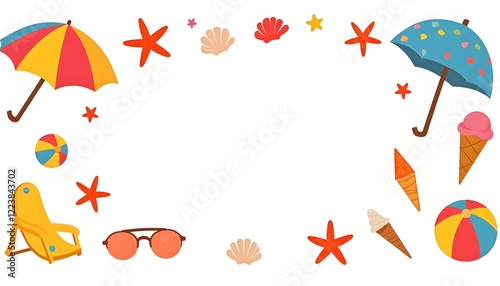 Summer Beach Scene With Colorful Umbrellas And Beach Toys