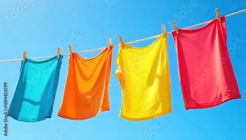 Summer Breeze Laundry Idyllic Clothesline Scene of Brightly Colored Linen Gently Flapping in a Clear Blue Sky. Perfect for Summer, Freshness, and Outdoor Living Themes.