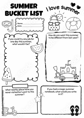 Summer Bucket List Writing Prompt Worksheet for Grades 2-6, End of Year Activity, Creative Writing, Coloring Pages, Summer Goals List