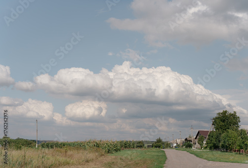 Summer clear sunny village landscape with white cumulus clouds, road and houses along street