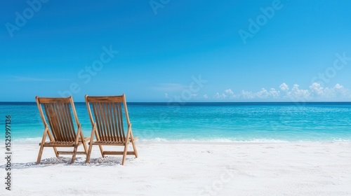 summer concept. Two beach chairs facing a serene blue ocean and clear sky.