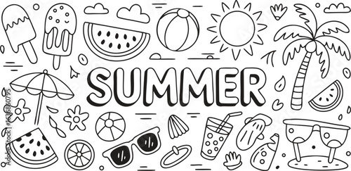 Summer Doodle Illustration – Beach, Sun, Watermelon, and Vacation Vector Illustration