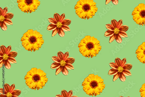 Summer flowers pattern. Yellow and orange blossom on green background. Minimal concept.