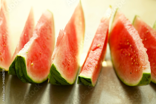 Summer foods background. Ripe watermelon slices in a plate, on warm background