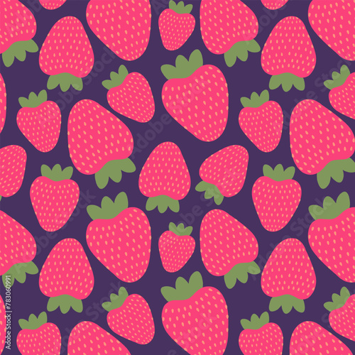 Summer fruit seamless pattern with pink strawberries, on a dark blue background. Vector illustration