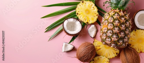 Summer Fruits: Pineapples and Coconuts Against a Pastel Pink Background