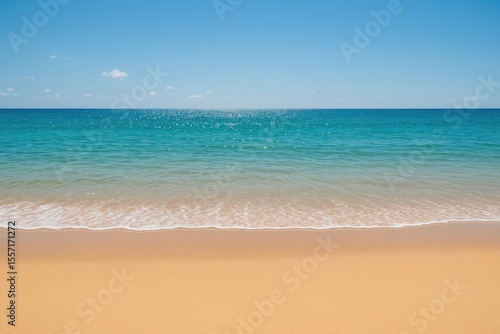 Summer getaway scene featuring a sandy shoreline with shimmering ocean water under bright sunlight