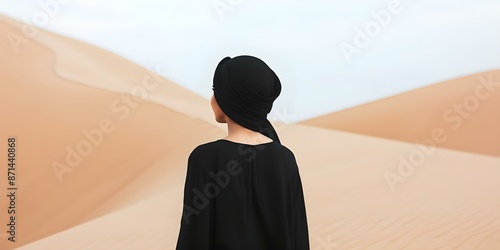 Summer gorpcore fashion Model in black turban walking desert dunes. Concept Fashion Photoshoot, Gorpcore Trends, Desert Landscapes, Turban Styling, Summer Vibes