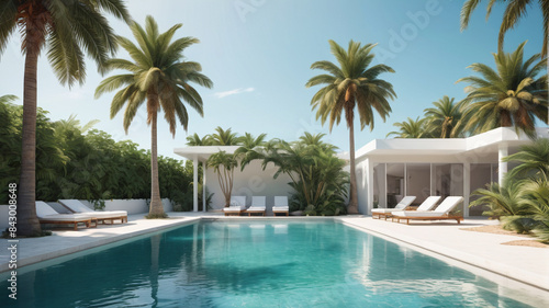 Summer Haven Banner: Discover Your Haven of Relaxation with a Stunning Pool Scene Highlighting a Palm Tree and White Structure, Generative AI