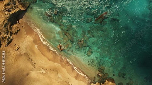 Summer holiday on a deserted beach: top view of the sea, sand and crystal water.
