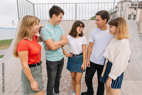 Summer holidays and teenage concept - group of smiling teenagers hanging out outside.