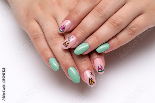 Summer manicure. Mint, beige manicure with drawn pizza, watermelon, on long oval nails close-up on a white background.
