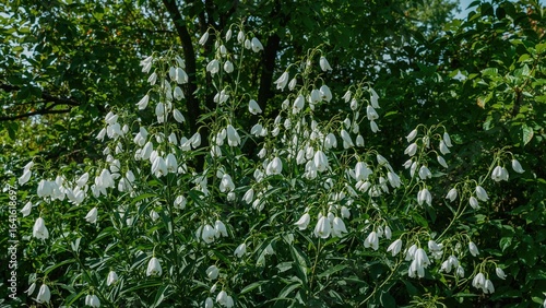 Summer morning scene featuring pretty white flowers and lush green tree leaves