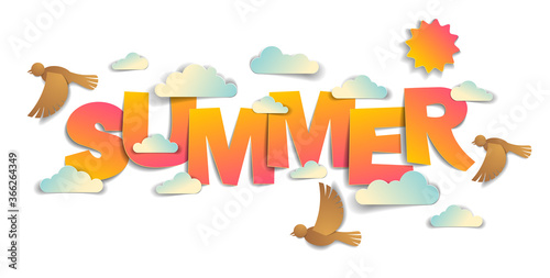 Summer papercut word with birds sun and clouds vector modern style cartoon paper cut 3d illustration.