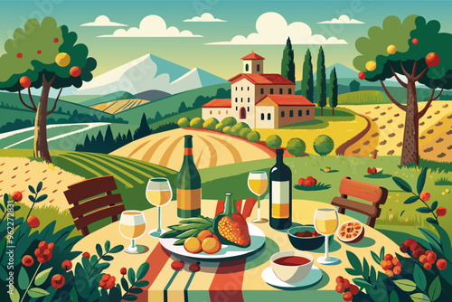 Summer Picnic in Italian Countryside with Wine, Food and Beautiful View
