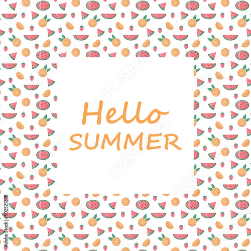 Summer postcard with a frame of fruits of watermelons, oranges and strawberries