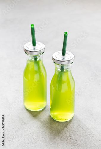 Summer refreshing drink made of gooseberries in a glass bottle with a lid and a straw on a light background